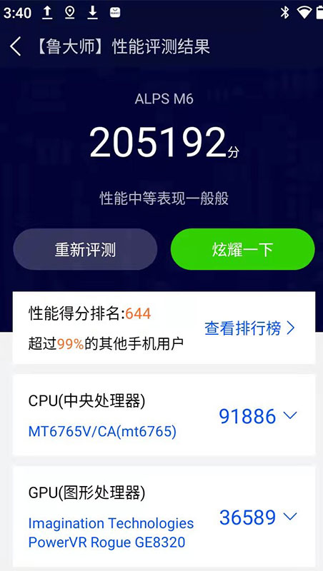 由安兔兔测评可以看出,AORO遨游M6搭载8核处理器MT6765V/CA,架构为4*ARM Cortex-A53+ 4*ARM Cortex-A53,采用12nm工艺,刷新率为60Hz。